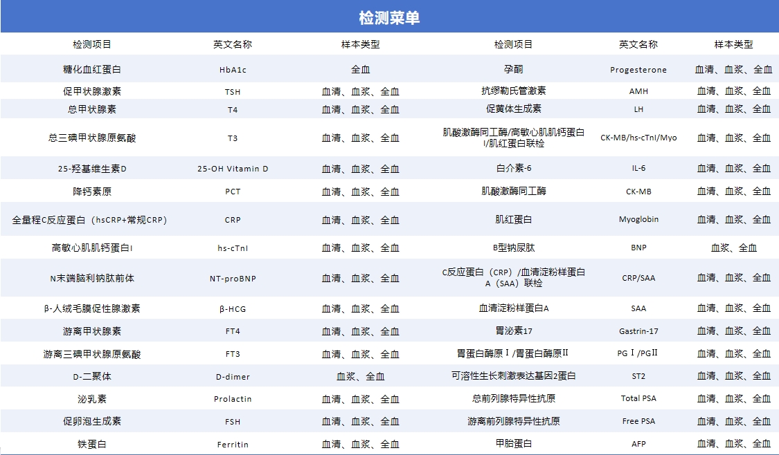 操作简单,检测快速,结果准确,覆盖多种快速检测场景,提供不同通量检测机型。 可快速检测心肌、炎症、糖化、甲功、肿标、激素、骨代谢、妇幼健康等项目。